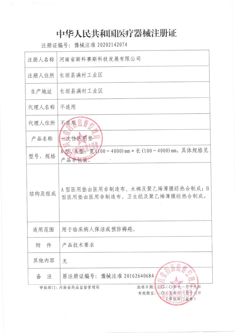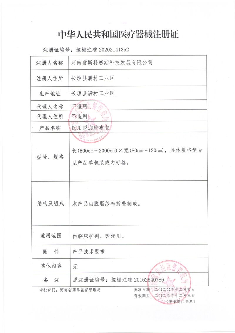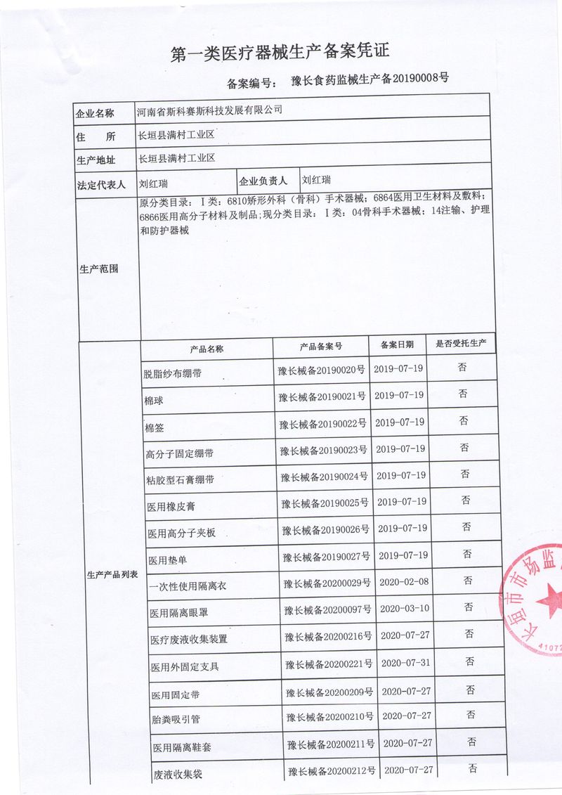 河南省斯科賽斯科技發(fā)展有限公司創(chuàng)建于 2011 年,位于“中國醫(yī)療耗材之都”- 河南省長(zhǎng)垣縣,西臨 308 省道,南靠新菏鐵路,北依長(zhǎng)濟(jì)高速,交通便捷,經(jīng)濟(jì)發(fā)達(dá),環(huán)境優(yōu)美。斯科賽斯積極進(jìn)入醫(yī)療健康和服務(wù)領(lǐng)域,秉承為用戶創(chuàng)造價(jià)值的理念,專注于醫(yī)用耗材解決方案的研發(fā)和運(yùn)營(yíng),并為用戶提供完善的產(chǎn)品解決方案;  斯科賽斯主要生產(chǎn)醫(yī)用麻醉系列、醫(yī)用高分子系列、醫(yī)用敷料包系列、醫(yī)用無紡布系列、醫(yī)用防護(hù)系列、醫(yī)用脫脂棉系列、生物材料制品類等七大類、100 多個(gè)品種、400 多個(gè)規(guī)格的產(chǎn)品。公司占地面積約 30000 平方米,建筑面積20000 平方米,擁有 10 萬級(jí)的凈化車間總面積 10000 平方米。擁有國際先進(jìn)水平的生產(chǎn)設(shè)備和檢測(cè)儀器,技術(shù)裝備精良,檢測(cè)手段完善,為醫(yī)療行業(yè)的不斷發(fā)展進(jìn)步提供保障。公司順利通過 ISO9001、ISO13485 質(zhì)量管理體系認(rèn)證。  斯科賽斯堅(jiān)持研發(fā)高科技新產(chǎn)品,力爭(zhēng)在醫(yī)療器械關(guān)鍵領(lǐng)域取得技術(shù)和研發(fā)的重大突破;立足國內(nèi)和國際兩個(gè)市場(chǎng),逐步實(shí)現(xiàn)管理理念、經(jīng)營(yíng)機(jī)制、人力資源、技術(shù)、產(chǎn)品、市場(chǎng)等全方位對(duì)接,提高企業(yè)的核心競(jìng)爭(zhēng)力;過去的歲月里,斯科賽斯砥礪前行,誠信務(wù)實(shí),銳意進(jìn)取,不斷創(chuàng)新,用自己的睿智和辛勞,以富有責(zé)任感的使命,在探索中追求,在追求中超越,致力于成為值得信賴的醫(yī)療用品生產(chǎn)企業(yè)!在未來的日子里,斯科賽斯將一如既往豪情滿懷,信心百倍,攜手并肩,執(zhí)著追求,向更高的的目標(biāo)前進(jìn),鑄造新的輝煌!